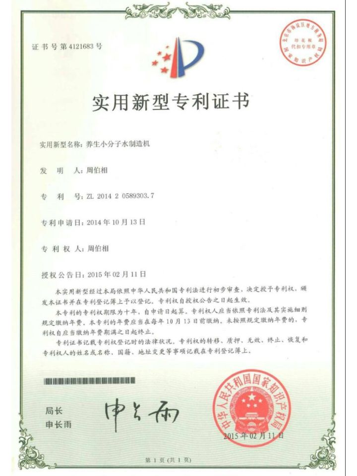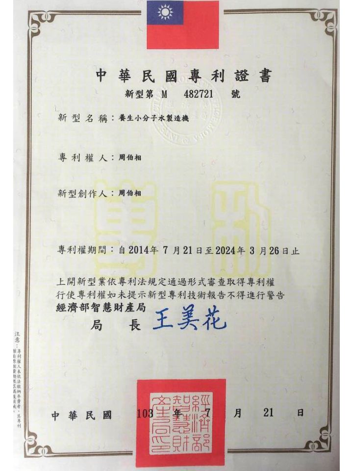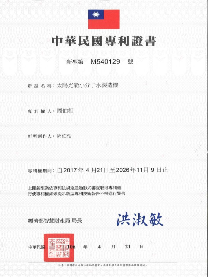 太陽光能小分子水製造機 榮獲中華民國與中華人民共和國國家專利權
